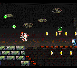 At the end of the level, a gate-hack using a forward spit enemy can be done to open the gate to the exit pipe. In order for it to work, you must tongue one of the green spikey guys or its pot, give it a negative (left) x speed, such as by spitting it against the gate and having it bounce backwards, then respitting it into the gate. This is shown in the gif below. A faster way of getting this leftward momentum is shown in the videos to the right.