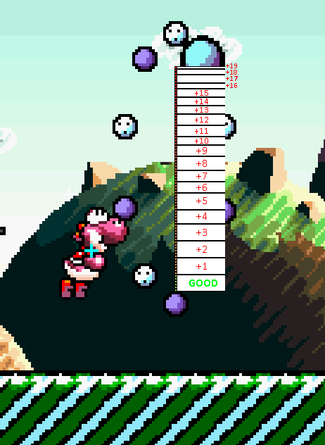 • Entering the bottom of the goal ring saves time over hitting the middle or top of the ring. This is due to Baby Mario being caught by the next Yoshi sooner. The difference between the very bottom and the peak height of a jump is 10 frames. Bottom entry. High entry.