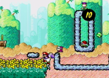 Strat 1: Run past the egg spitter plant avoiding eggs as you go. Get to the peak point of the foam, when Yoshi makes his trademark sound throw an egg up. Flutter to the right and take the Lakitu cloud and move above the left side of the foam platform shaped like a line where the yellow shyguy is. (The earlier you throw the egg the sooner the level ends. The point I described is about the latest you can throw it.)